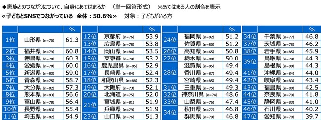 「子どもとSNSでつながっている」 子どもがいる人の51%、都道府県別の1位は山形県