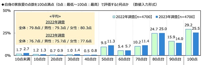 自身の家族愛を100点満点で評価すると? 全体平均は76.7点、前回調査から3.1点低い結果に