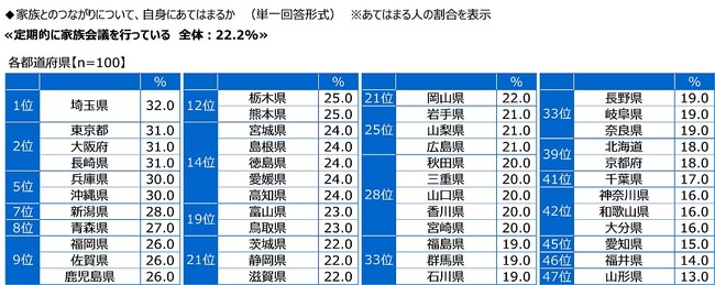 「定期的に家族会議を行っている」 全体の22%、都道府県別の1位は埼玉県