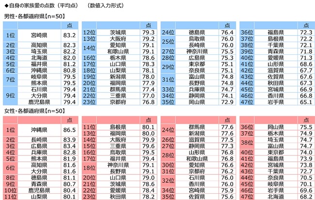 男女・都道府県別にみると、平均は男性では1位が宮崎県(83.2点)、2位が高知県(82.3点)、3位が埼玉県(82.2点)、女性では1位が沖縄県(86.5点)、2位が長崎県(83.9点)、3位が広島県(83.4点)でした。