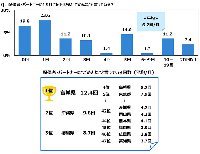 都道府県別にみると、配偶者・パートナーに1カ月に“ごめんね”と言っている回数の平均は、1位「宮城県」(12.4回)、2位「沖縄県」(9.8回)、3位「徳島県」(8.7回)でした。