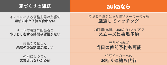 住宅購入検討者と住宅メーカーのマッチングプラットフォーム「auka(アウカ)」を運営するギバーテイクオール株式会社(本社:東京都港区、代表取締役CEO 河野清博、以下当社)は、新サービス「aukaダイレクト」をリリースいたしました。住宅購入を検討するエンドユーザーは、aukaにご登録いただくとLINE上から好みの住宅メーカーを探して2タップで簡単に来場予約を行うことができるようになり、訪問後に継続相談を見送りたい場合には、aukaがお断り連絡を代行します。来場にかかる手間やコスト、心理的なストレスを減らし、気軽に効率的な家づくりができるようになります。