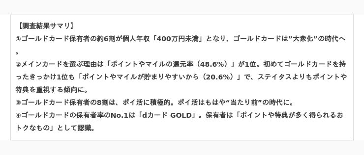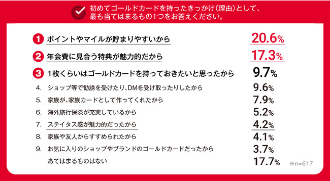 ~初めてゴールドカードを持ったきっかけは「ステイタス感(4.2%)」に大差を付けて「ポイントが貯まりやすいから(20.6%)」がトップ。最重視ポイントは「おトクさ」に~