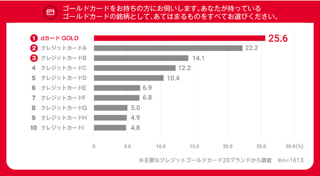 ・保有しているゴールドカードについて聞いたところ、1位は「dカード GOLD(25.6%)」に。ゴールドカード保有者の4人に1人がdカード GOLDを保有している結果となりました。