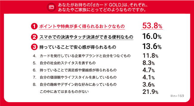 ・「dカード GOLD」が自身や家族にとってどういったものか聞いた質問に対しては、1位が「ポイントや特典が多く得られるおトクなもの(53.8%)」、次いで「スマホでの決済やタッチ決済ができる便利なもの(16.0%)」、「持っていることで安心感が得られるもの(13.6%)」と、圧倒的に”おトクなカード”として捉えているという結果に。