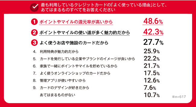 ■図3:最も利用しているクレジットカードの「よく使っている理由」として、あてはまるものすべてをお答えください。(ゴールドカード保有者 n=617)