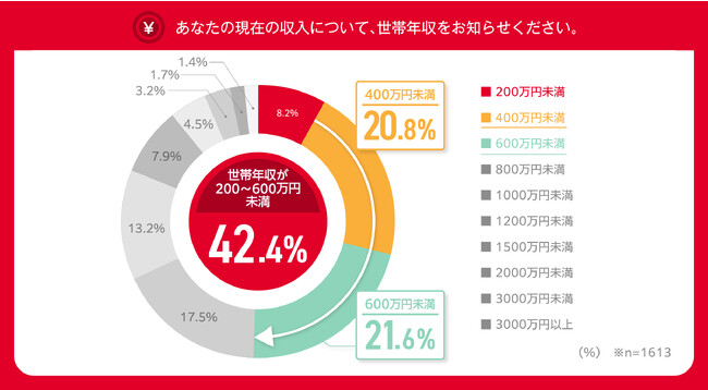・個人年収を聞いた質問では、1位が「200万円未満(39.6%)」、次いで「200万円~400万円未満(23.2%)」、「400万円~600万円未満(17.2%)」に。さらにゴールドカード保有者で個人年収が「400万円未満」の人のなかには、専業主婦(主夫)や学生なども多く含まれており、誰でもゴールドカードを持つ時代になったと言えます。一方、世帯年収では、「200万~600万円未満」が42.4%を占め、メインボリュームとなっております。
