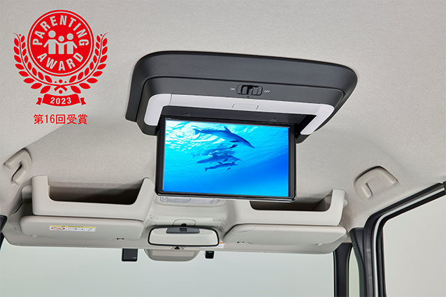 1.リア席モニター:クルマでの移動中に、前席で大人が流すものをコントロールしながら、後席の子どもたちは地上デジタル放送やDVD(追加オプションでスマートフォンの映像も同期可)などの映像を画面までの距離の近さを心配せずに大画面で楽しめます。