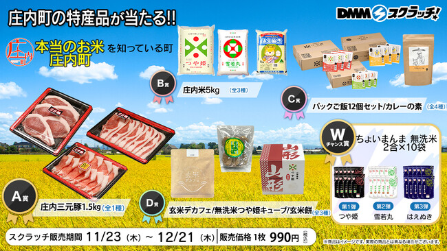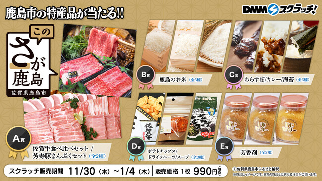 合同会社DMM.com(本社:東京都港区、会長 兼 CEO亀山敬司、https://dmm-corp.com/ 以下DMM )が展開するハズレなしのオンラインくじサービス「DMMスクラッチ」は、地方創生事業「DMM 地方創生」と共に、地方自治体とコラボレーションした賞品の展開を開始することをお知らせいたします。第1弾として、2023年11月23日より山形県庄内町、2023年11月30日より佐賀県鹿島市のオンラインくじを販売します。地方の特産品を、お得にお楽しみいただけます。