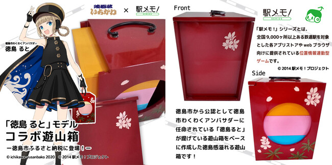 徳島市は、『徳島市わくわくアンバサダー』である、位置情報連動型ゲーム「ステーションメモリーズ!」「駅メモ! Our Rails」(以下、「駅メモ!」シリーズ)のキャラクター「徳島ると」とコラボした、徳島の伝統工芸品の遊山箱をふるさと納税の返礼品としての取扱いを数量限定で開始しました。