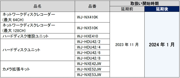 パナソニック コネクト株式会社(本社:東京都中央区、代表取締役 執行役員 プレジデント・CEO:樋口 泰行)は、2023年10月3日に発表のi-PRO株式会社(本社:東京都港区、代表取締役社長:尾崎 祥平、以下i-PRO社)製 NXシリーズ ネットワークディスクレコーダーの内「ネットワークディスクレコーダー“WJ-NX410K,WJ-NX510K”各1種」、「増設ユニット1種」、「ハードディスクユニット4種」、「カメラ拡張キット3種」について、i-PRO社の発売延期に伴い弊社取扱い開始時期を次のとおり延期させていただきます。