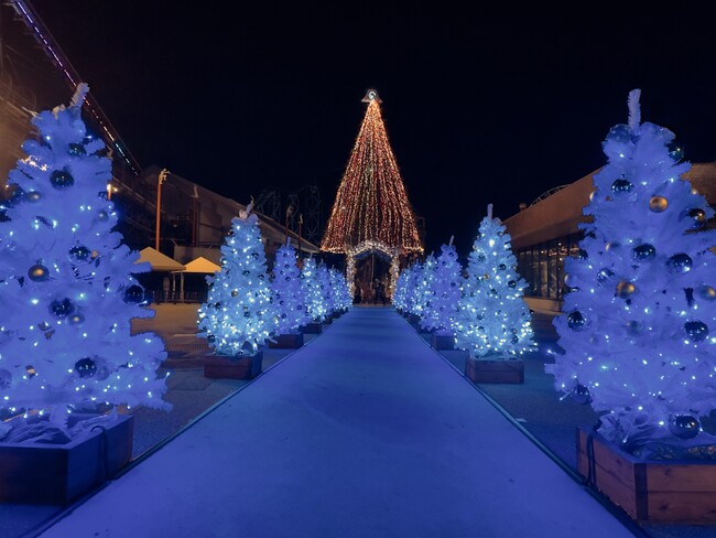 メインエントランスである第一入園口付近には、高さ20mの巨大ツリーに向かって40本のホワイトツリーが立ち並ぶ「クリスマスロード」が登場。夜になるとイルミネーションが光り輝き、お客様を幻想的な世界へと誘います。