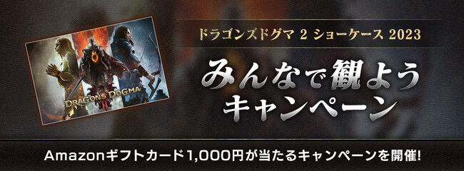 2023年11月29日(水)AM6:00に配信が決定した「ドラゴンズドグマ 2 ショーケース 2023」を記念して、配信までの9日間、Amazonギフトカード1,000円が抽選で10名、合計90名様に当たるキャンペーンを開催いたします。