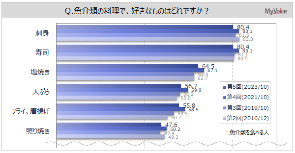 魚介類の料理で好きなものは(複数回答)、「刺身」「寿司」が魚介類を食べる人の各8割、「塩焼き」が64.5%、「天ぷら」「フライ、唐揚げ」が約56~57%、「照り焼き」「干物」が各5割弱です。