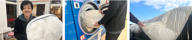 ※家庭用の洗濯機だと、容量や洗浄力・乾燥力が足りず生地の痛みや匂いが発生する場合がございます。洗濯は必ずコインランドリーで行ってください。