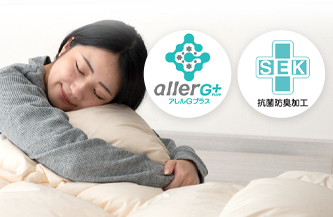 “アレルGプラス”とは天然ミネラルから抽出した無害・安全成分を使用した、抗アレルゲン効果を持つ高機能性付加原料でハウスダスト・ダニ・花粉などのアレル物質を低減する効果と、デオドラント効果、抗菌作用などがあります。また、これらの効果の持続性が高いのも特徴で、洗濯しても抗菌防臭効果が持続し、繊維評価技術協会が定める抗菌防臭加工のSEKマークを取得しています。