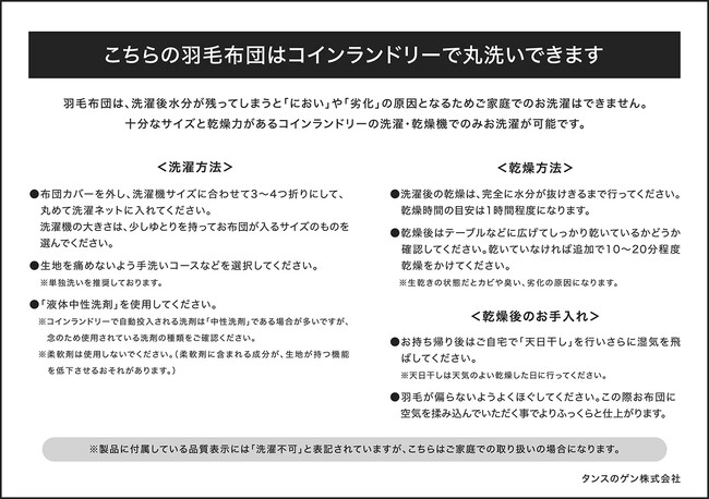 シーズン毎に羽毛布団を洗って使える!タンスのゲンよりコインランドリーで洗うことができる羽毛布団を2種類発売開始~専門のクリーニング業者に出すことなく、冬の時期の終わりに洗濯することで、いつまでも清潔に