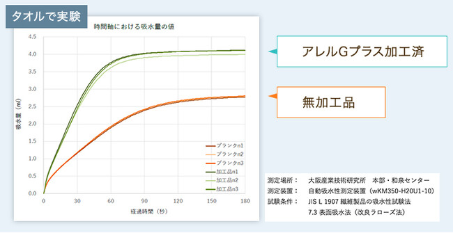 さらにこの加工で「親水性」も向上し、第三者機関での検査でも、無加工のものと“アレルGプラス”加工済のものでは吸水量に約1.5倍の差があることが証明されております。