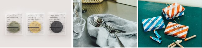 左: 鳥取県米子市にある、手作りにこだわる進製作所とコラボレーションした「洗顔せっけん」