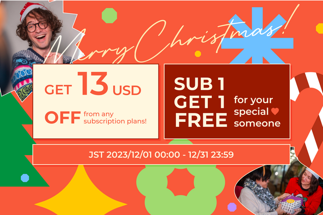 クリスマスキャンペーン期間中、サブスクリプションオーダーで利用可能な2000円OFF($13OFF)クーポンを配布します。また、12月中に文房具ボックスをご注文いただいたお客様には、文房具ボックスを1箱無料でプレゼントいたします。