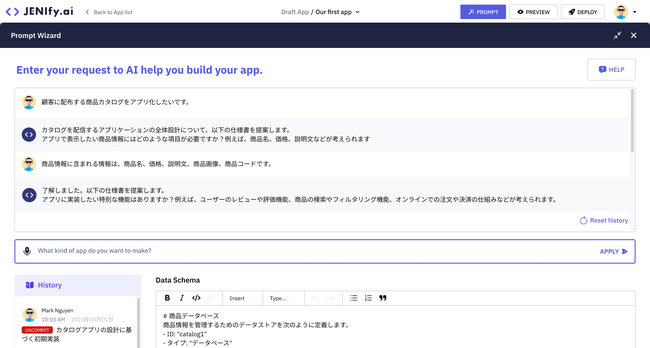 Jenify.aiでは、生成AIが自然言語形式の詳細プロンプトからコードを生成するので、これまでのノーコード開発ツールでは難しかった柔軟なアプリ開発が可能になります。