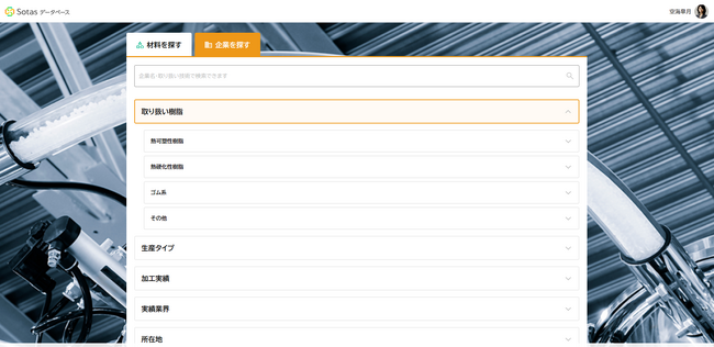 素材のプラットフォームを目指す化学産業特化のSaaSスタートアップSotas株式会社(所在地:神奈川県川崎市、代表取締役社長:吉元 裕樹、以下「当社」)は、化学商社・メーカーがプラスチック成形企業情報を検索できる「Sotasデータベース」を大幅にリニューアルリリースいたしました。約4,000社のプラスチックやゴム企業の情報検索、約8,000件の汎用樹脂の情報検索に加え、自社で保有している樹脂情報をインポートし、クラウド型の自社データベースとして活用いただける機能も新たに開発いたしました。