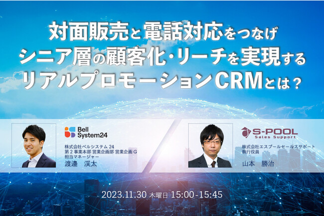 株式会社ベルシステム24(本社:東京都港区、代表取締役 社長執行役員:野田 俊介、以下:ベルシステム24)は、株式会社エスプールセールスサポート(本社:東京都千代田区、代表取締役会長兼社長:浦上 壮平、以下:エスプールセールスサポート)と共同で、「対面販売と電話対応をつなぎ、シニア層へのリーチと顧客化を実現するリアルプロモーションCRMとは?(以下:本セミナー)」と題したオンラインセミナーを、11月30日(木)に開催します。