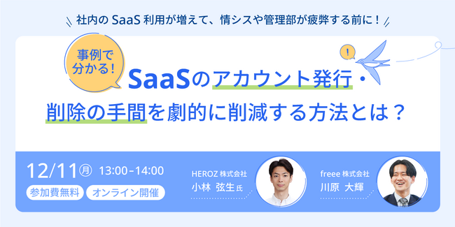 freee株式会社(本社:東京都品川区、CEO:佐々木大輔、以下「freee」)は12月11日(月)13:00~14:00「事例で分かる!SaaSのアカウント発行・削除の手間を劇的に削減する方法とは?」セミナーをオンラインで開催します。