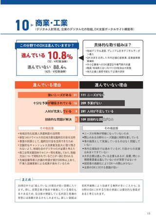 全体的に、「商業・工業」分野のDX進捗は低いと評価されていますが、民間企業が独自にDXを推進しているケースが散見されるため、自治体が把握している進捗と実際の現場にはギャップが存在する可能性が指摘されています。官民学の連携による新しい取り組みが加速している事例も多く、自治体のDX推進における参画には、財源の確保や事業の企画、連携の枠組み作りなど、多面的な取り組みが必要とされています。
