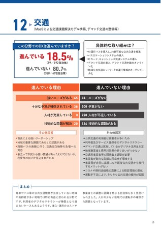 交通分野における自治体DX進捗状況:18.5%がデジタル化を推進 / AI運行バスの導入、バスロケーションシステムの整備、ICカードやキャッシュレス決済システムの導入、デマンド交通の導入