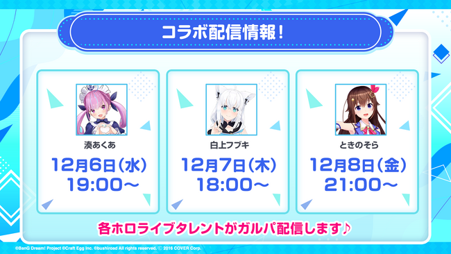 スマートフォンアプリの企画開発事業を展開する株式会社Craft Egg(本社:東京都渋谷区 代表取締役:森川 修一、以下、Craft Egg)と、株式会社ブシロード(本社:東京都中野区 代表取締役社長:木谷 高明、以下、ブシロード)の共同制作によるスマートフォン向けゲーム「バンドリ! ガールズバンドパーティ!」(以下、ガルパ)は、2023年11月30日(木)の「バンドリ!TV LIVE 2023 #195」にて、2023年12月6日(水)より開催する「第2弾ガルパ×ホロライブコラボ」に登場するすべてのタレントを発表いたしました。