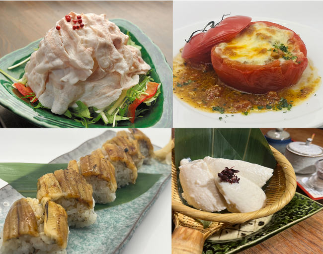 12月1日からメニューを一新し、各都道府県の代表的なご当地グルメを取り揃えます。青森県自然薯豆腐、秋田県桃豚冷しゃぶサラダ、広島県穴子棒寿司の他、熊本県産のトマトを使用したメニューを豊富に取り揃えました。アラカルトの他、コース料理も提供開始予定です。