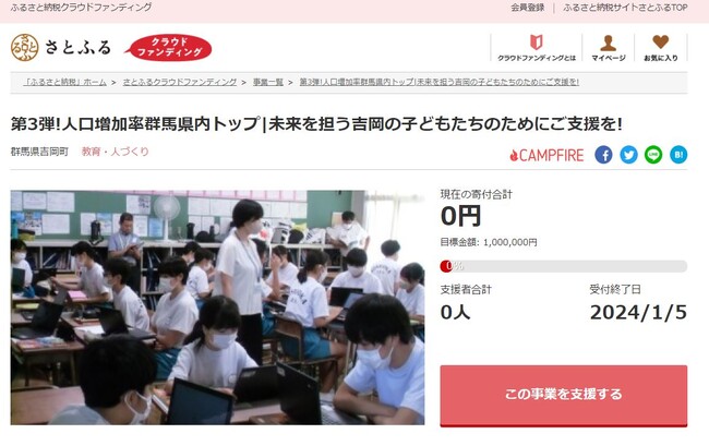 事業名:第3弾!人口増加率群馬県内トップ|未来を担う吉岡の子どもたちのためにご支援を!