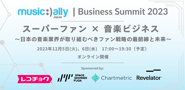 - 【2023/12/5(火)~6(水)開催】<スーパーファンx音楽ビジネス> Music Ally Japan ビジネスサミット:日本の音楽業界が取り組むべきファン戦略の最前線と未来~登壇者第一弾発表!11/10 18:40
