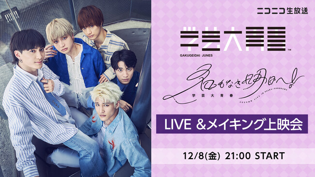そんな彼らが11月4日(土)に開催した、南優輝脱退前の5人体制での最後のライブ「学芸大青春 Autumn LIVE in OSAKA & YOKOHAMA ~名もなき明日へ!~」KT Zepp Yokohama公演を、ライブ映像に当日のメイキング映像を追加した完全版で、2.5次元やっぱニコメンチャンネルにて放送いたします。