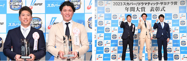 スカパー! は12月1日(金)に「2023 スカパー! ドラマティック・サヨナラ賞 年間大賞」の表彰式を開催しました。表彰式には受賞選手である、読売ジャイアンツ・坂本勇人選手(セ・リーグ)と千葉ロッテマリーンズ・角中勝也選手(パ・リーグ)が登壇しました。表彰式後には受賞両選手に加え、ゲストに松田宣浩氏をお迎えしトークショーが行われました。トークショーの終盤にはお笑い芸人のやす子さんが両選手を祝福しに登場するなど、終始お祝いムードに包まれた会となりました。