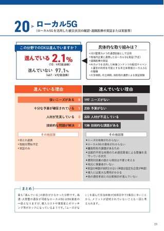 調査結果のまとめでは、ローカル5GはDX推進の一助となる可能性があるものの、導入コストや事業者とのマッチング、メリットの認知度が低いことが進捗の遅れの原因と考えられます。特に「ニーズがない」と回答した自治体数が20項目中で2番目に多いことから、ローカル5Gのメリットが十分に認知されていない可能性が指摘されています。