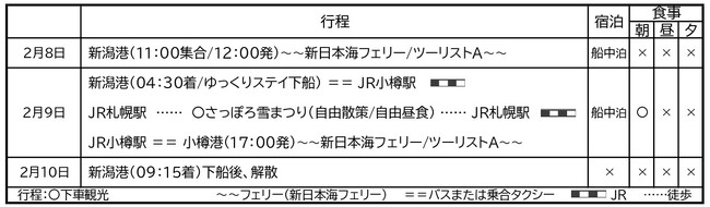 新日本海フェリーの新潟-小樽航路を利用し、船内2泊・現地0泊で楽しめる冬の北海道旅行