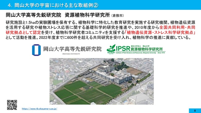 次に倉敷市の中心街にある岡山大学資源植物科学研究所の取組です。本研究所も岡山大学高等先鋭研究院の1つを成す研究機関です。