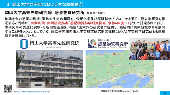 実際に岡山大学の宇宙の取組の一部を紹介しますと、一番に最初に挙げられるのは鳥取県三朝町にある岡山大学惑星物質研究所です。本研究所は「岡山大学高等先鋭研究院」を成す研究所のひとつであり、地球を含む惑星の形成・進化や生命の起源を、分析化学及び実験科学アプローチを通じて最先端研究を推進すると同時に、共同利用・共同研究拠点「惑星物質科学研究拠点(令和4年度~)」として認定されています。