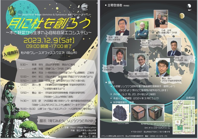 国立大学法人岡山大学(本部:岡山市北区、学長:那須保友)では、7th Global Moon Village Workshop & Symposiumに連動し、「月に杜を創ろう」というテーマで、一般の方を対象としたイベントを2023年12月9日(土)に杜の街グレースで開催します。