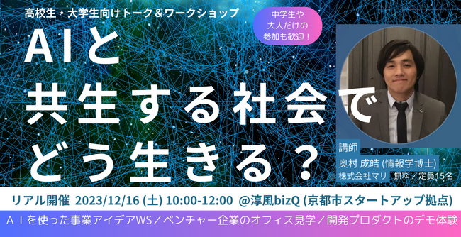 本イベントの一環として、12月16日(土)「淳風bizQ」に入居する株式会社マリ(本社:京都府京都市 代表取締役:瀧 宏文 以下、マリ)による高校・大学生向けワークショップ「AIと共生する社会でどう生きる?」を、参加費無料で実施します。