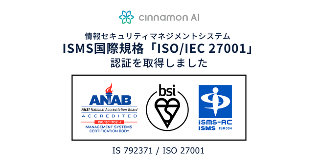 シナモンAI、情報セキュリティマネジメントシステム(ISMS)の国際規格「ISO/IEC 27001」を取得
