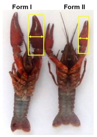 アメリカザリガニの成熟個体の形態には、繁殖可能時期のForm Iと繁殖できない時期のForm IIがありますが、成熟オスの第3・4歩脚に見られる小さな突起(鍵爪:Hook)のサイズがForm I・IIで有意に異なることを初めて確認しました。