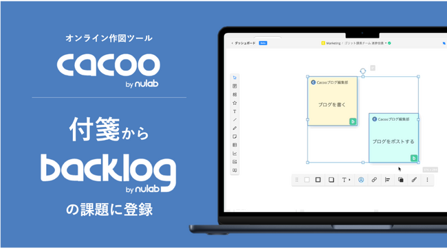 株式会社ヌーラボ(本社:福岡県福岡市、代表取締役:橋本正徳、以下 ヌーラボ)が提供しているオンライン作図ツール「Cacoo」に、図上で作成した付箋からそのままBacklogの課題に登録できる新機能をリリースしました。この機能追加により、オンライン会議で図を使いながらブレインストーミングやタスクの洗い出しをした場合でもスムーズにBacklogに課題登録ができるようになり、プロジェクトの進捗が向上することを期待しています。
