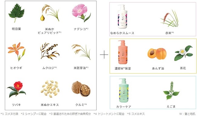 写真左から:カラーケア&ベーストリートメントライン、なめらかスムースケアライン、濃密W保湿ケアライン