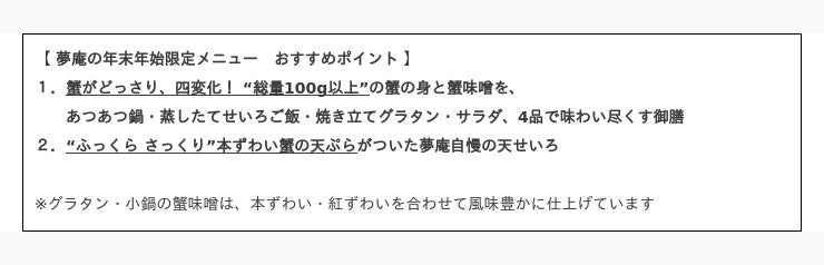 株式会社すかいらーくレストランツ(本社・東京都武蔵野市、代表取締役社長 中島 尚志)が運営する和食レストラン「夢庵」では、2023年12月7日(木)より、本ずわい蟹など厳選豪華食材を使用した鍋御膳やお蕎麦を、年末年始の期間限定で販売いたします。