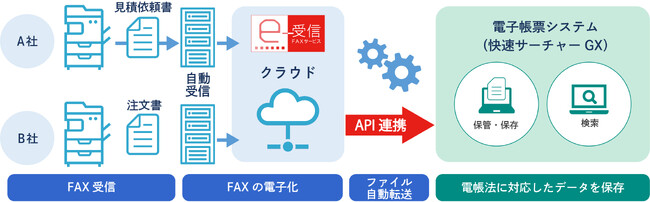 本連携により、FAXで受け取った見積依頼書や注文書などの帳票類は、「FNX e-受信FAXサービス」で電子データ化され、「快速サーチャーGX」に連携されるため、商取引のペーパーレス化や業務効率化に加え、電帳法が定義する「電子取引の保存要件」※2を満たした状態での保存が可能になります。