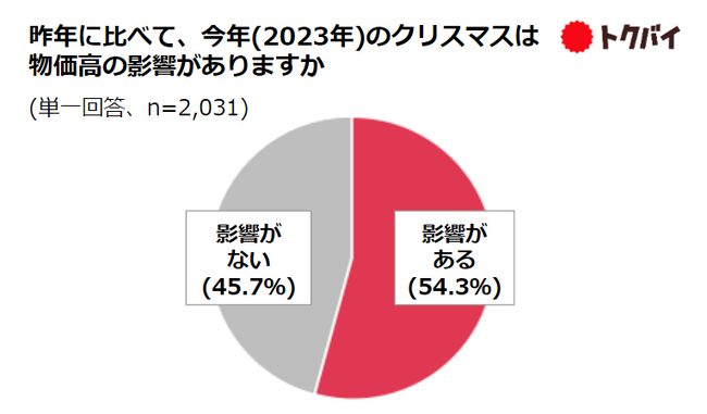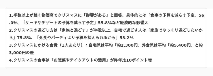 1. 半数以上が続く物価高でクリスマスに「影響がある」と回答、具体的には「食事の予算を減らす予定」56.0%、「ケーキやデザートの予算を減らす予定」55.8%など経済的な影響大
