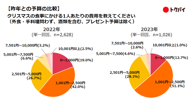 自宅・外食問わずクリスマスの食事にかける予算を昨年と比較すると、2,500円以下の回答の割合が約6割と、大きな変化は見られませんでした。物価高によりクリスマスにかける予算を削減する傾向にある中でも、実際の予算を一定の額から減らすことは難しい様子がうかがえます。